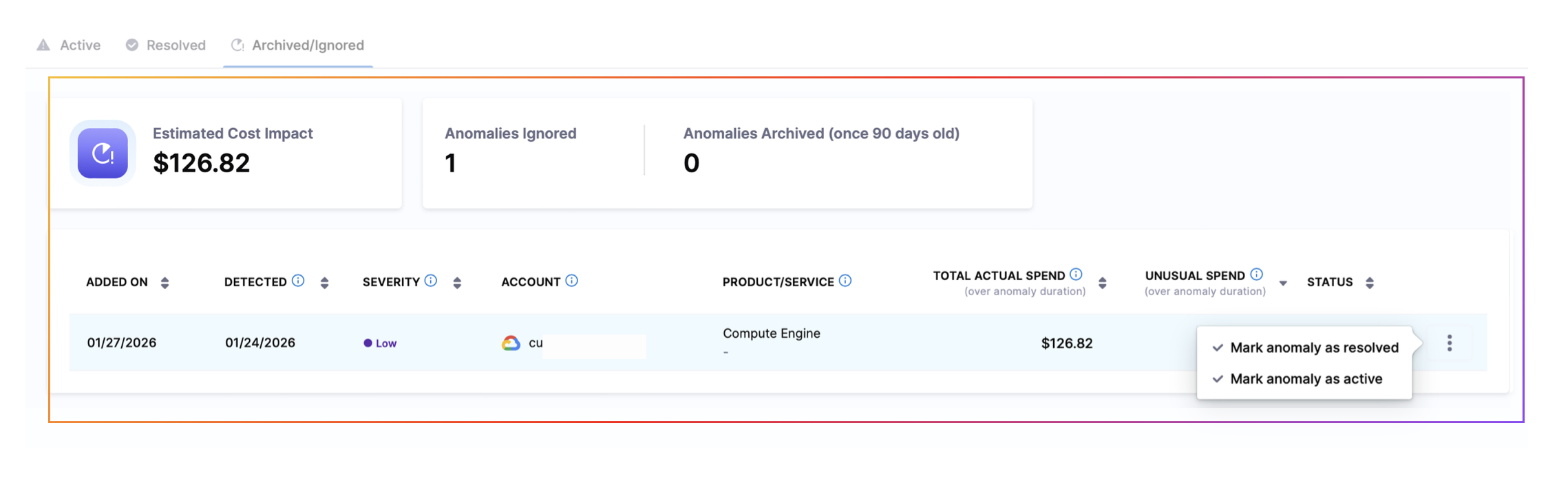 - Estimated Cost Impact: The total financial impact of all archived and ignored anomalies