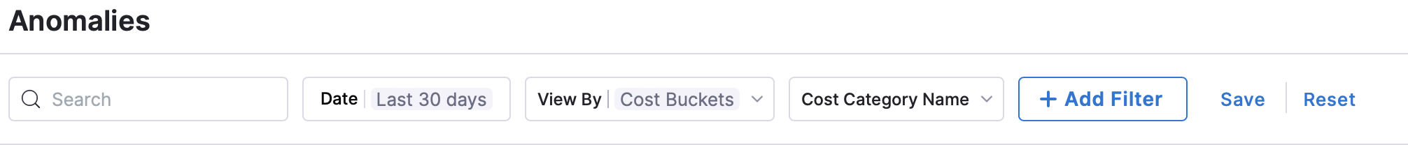 - Cost Buckets: Displays anomalies organized by specific Cost Buckets in your Cost Categories. When you select this option, an additional Cost Category Name filter appears, allowing you to narrow down anomalies to a specific Cost Bucket. This view is useful for understanding cost anomalies at a higher organizational level rather than at the individual resource level.