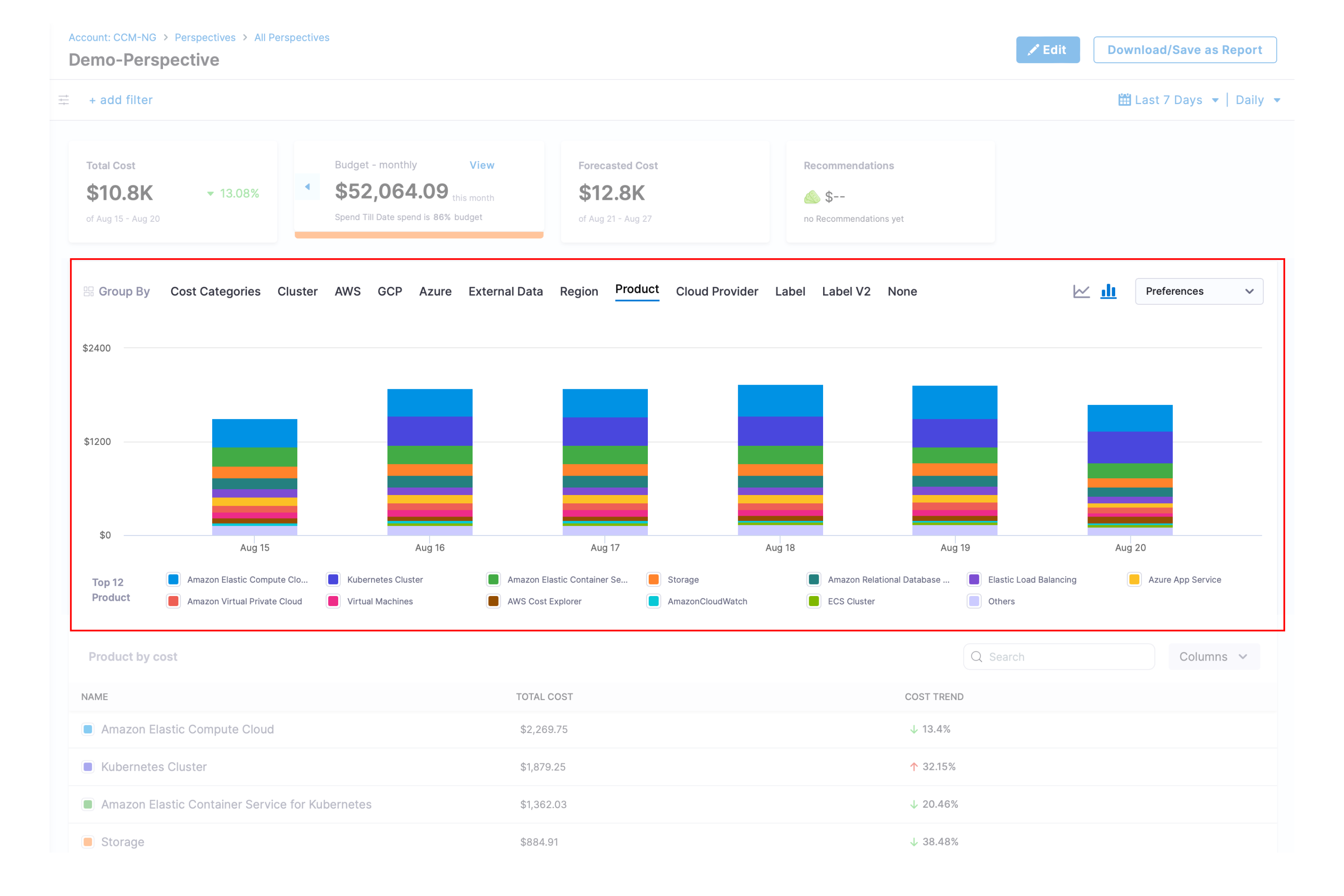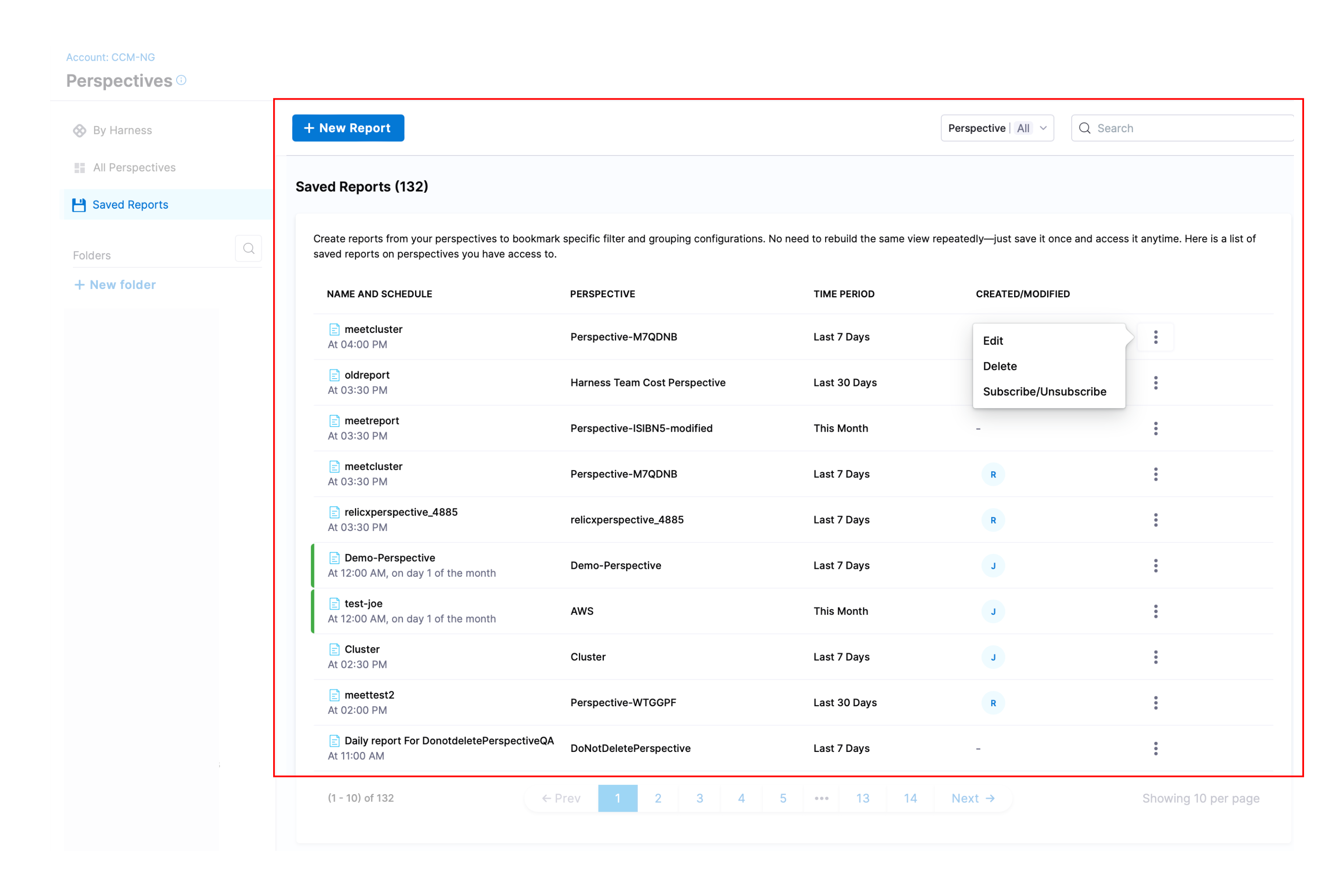To view and manage all your saved reports: Navigate to Cloud Costs > Perspectives > Saved Reports