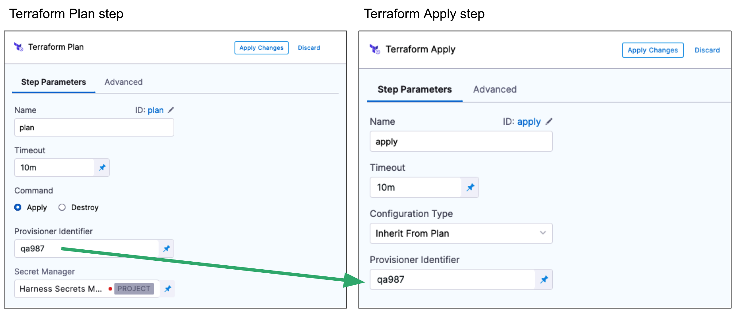 The most common use of Provisioner Identifier is between the Terraform Plan and Terraform Apply steps. To have the Terraform Apply step apply the provisioning from this Terraform Plan step, you use the same Provisioner Identifier in both steps.