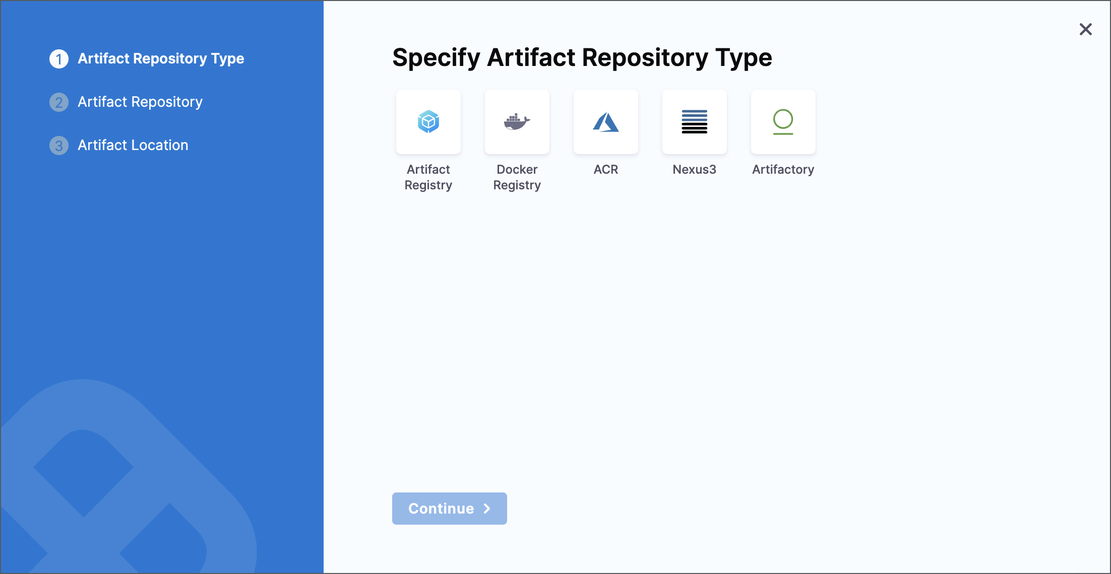 Currently, Harness supports Docker Registry, ACR, Nexus3, and Artifactory for artifact repositories. Choose where your artifact is stored, and click Continue.