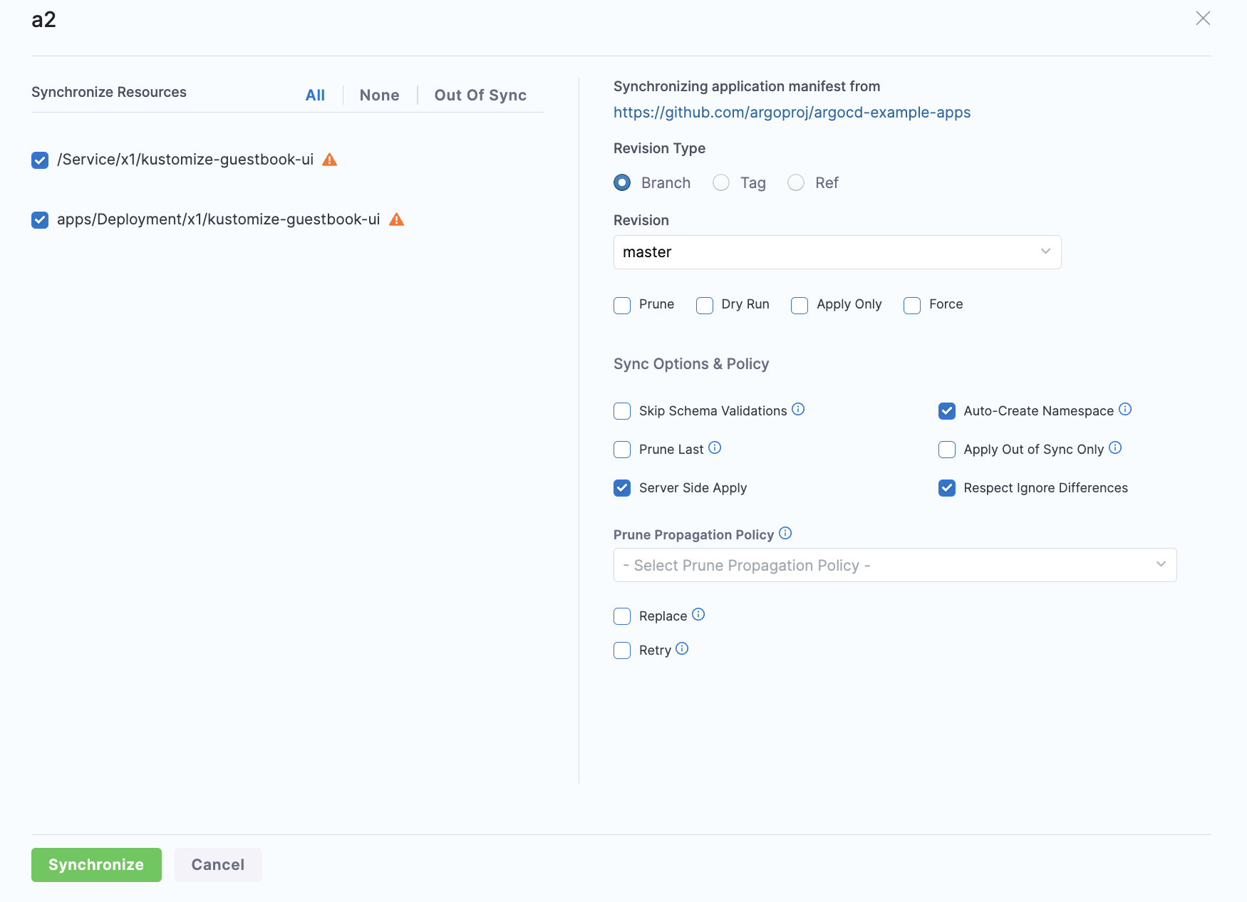 When synchronizing the application, you have the option to apply a specific revision. By default, target revision of the application is selected.