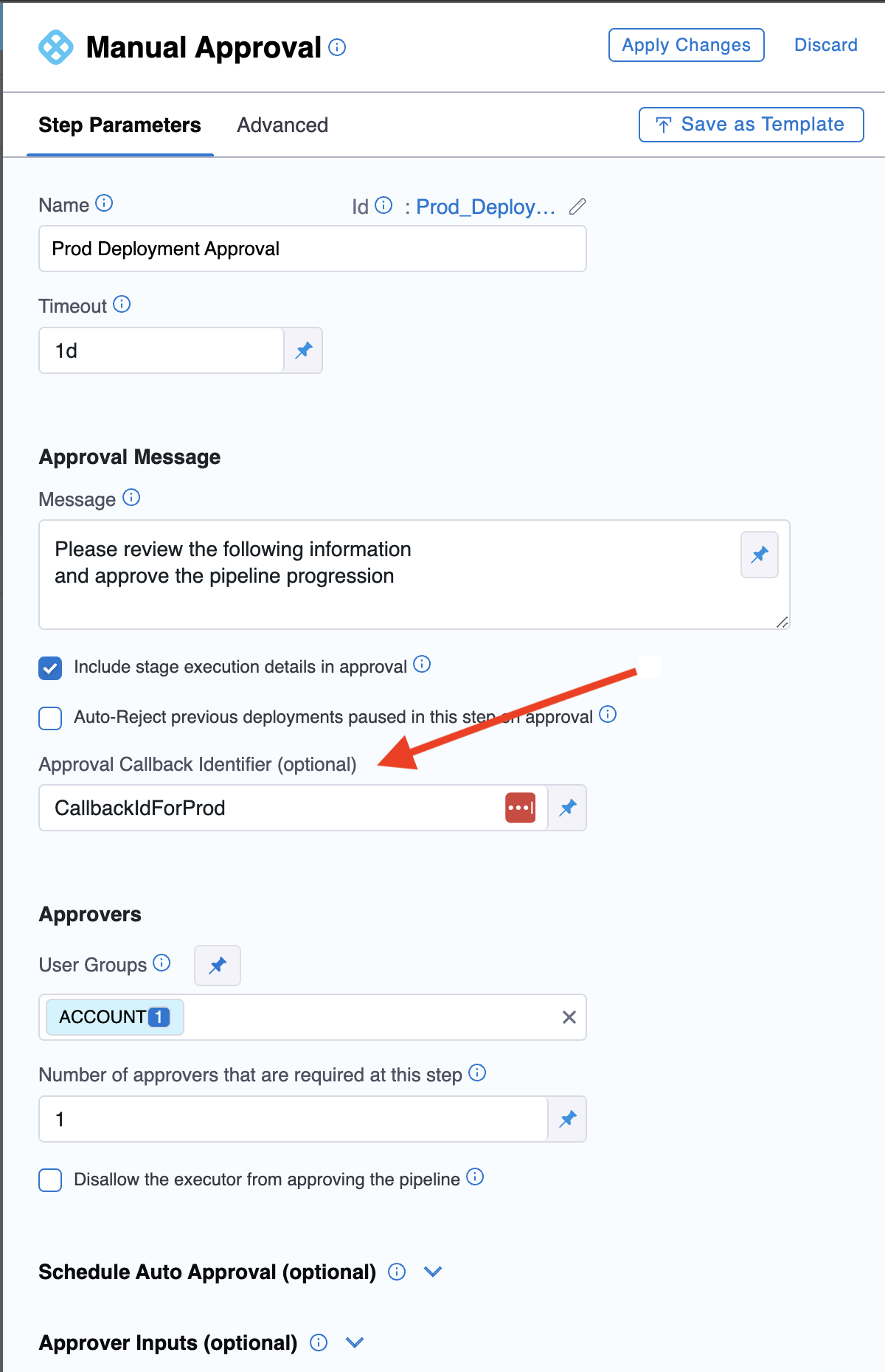 This Harness Approval step will use the unique callback identifier created in first step and wait for an approval(either manual or through an API)
