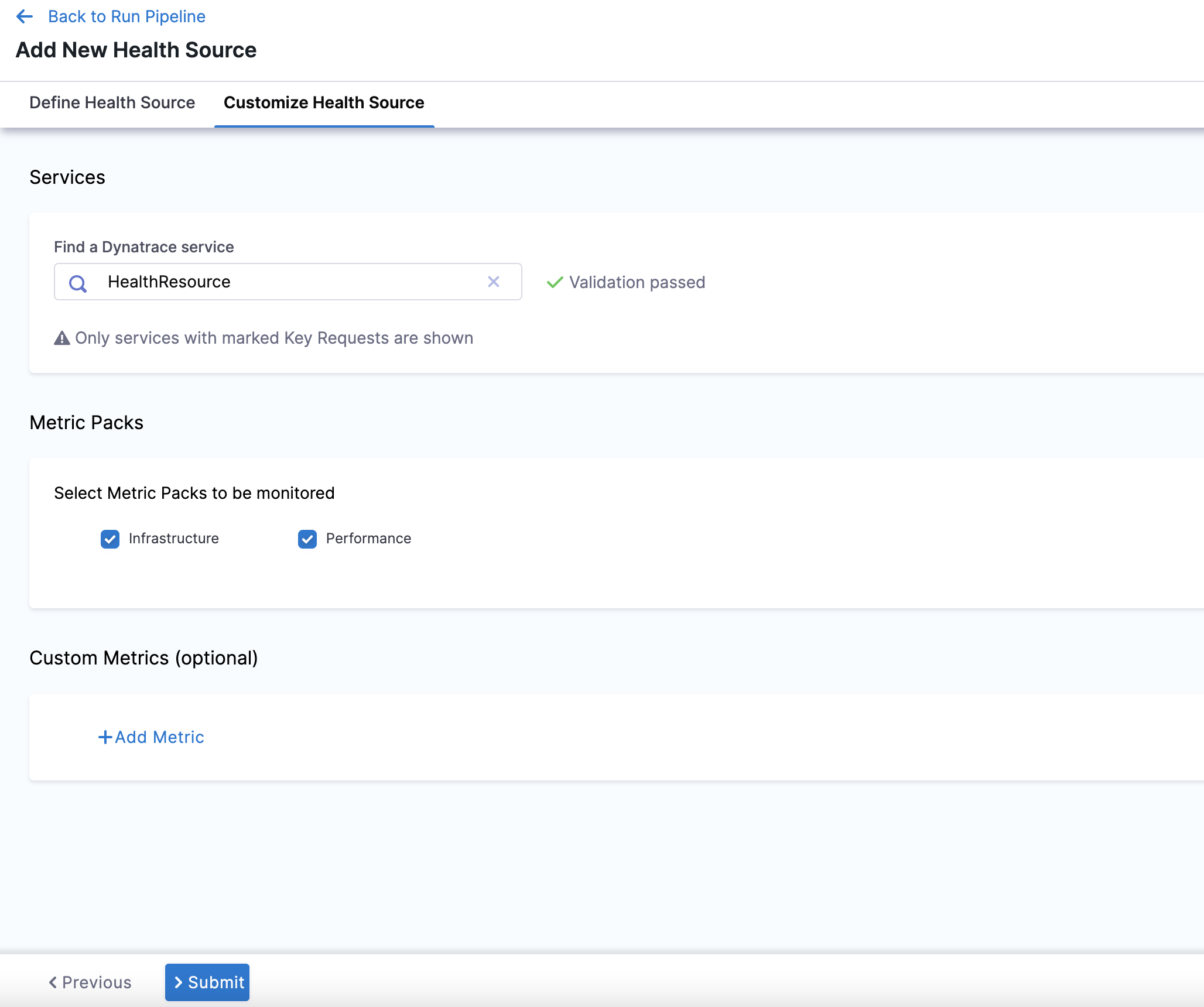 - In Select Metric Packs to be monitored, you can select Infrastructure, Performance, or both.
