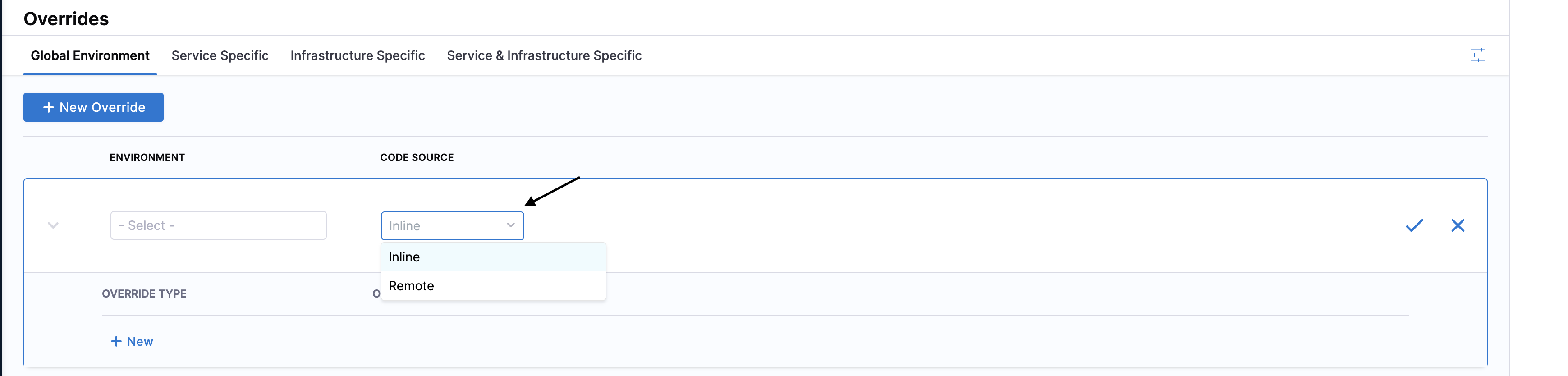 You have the option to select Inline or Remote code source under all override methods.