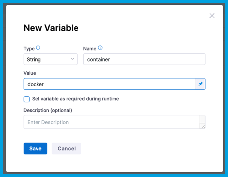 This error can be resolved by adding a Docker container environment variable. To do this, add a stage variable named container with the value docker.