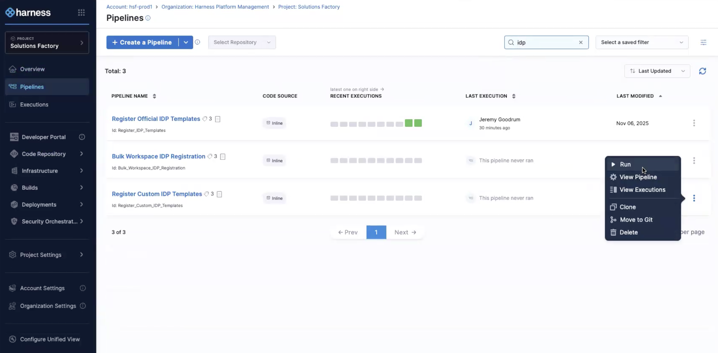 Solutions Factoryproject in your Harness Account - Filter your pipelines by typing