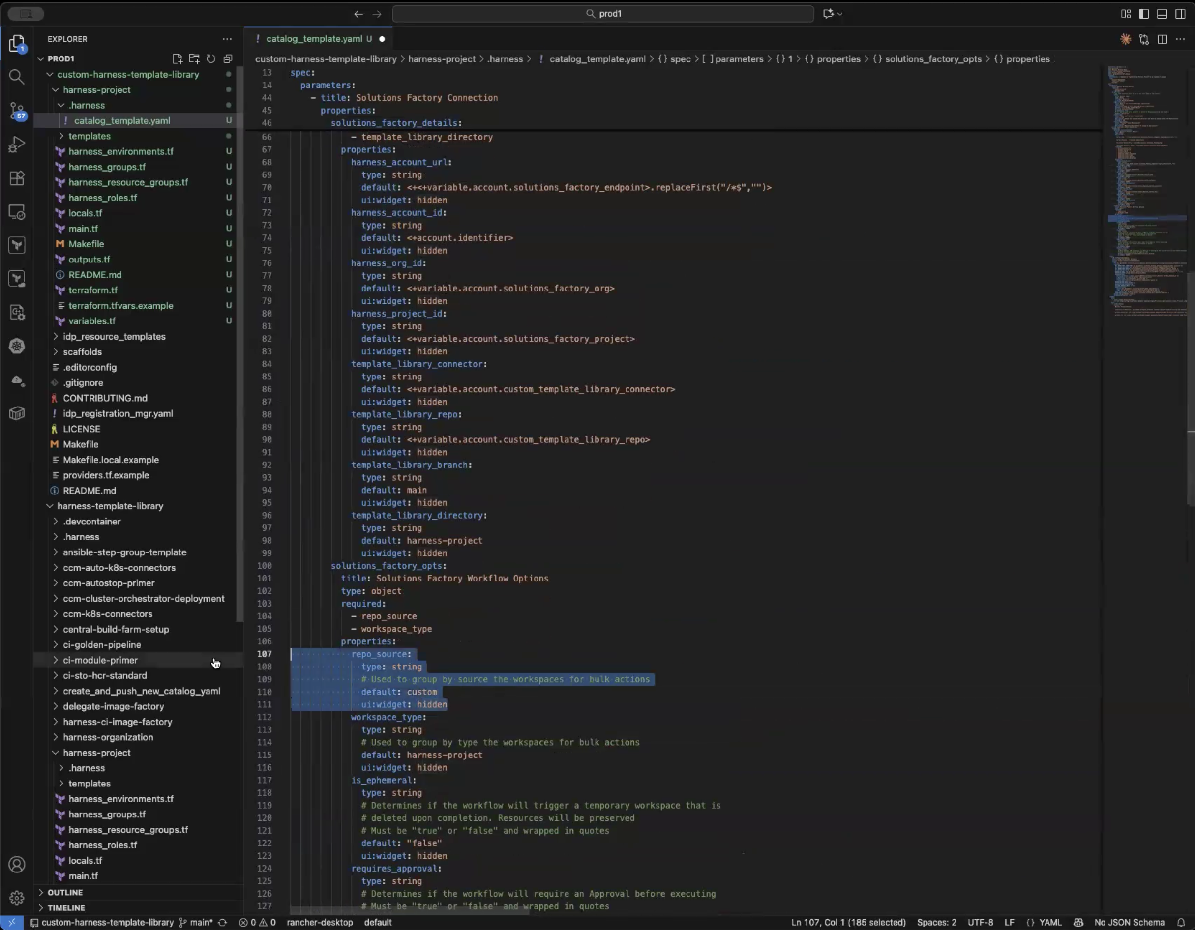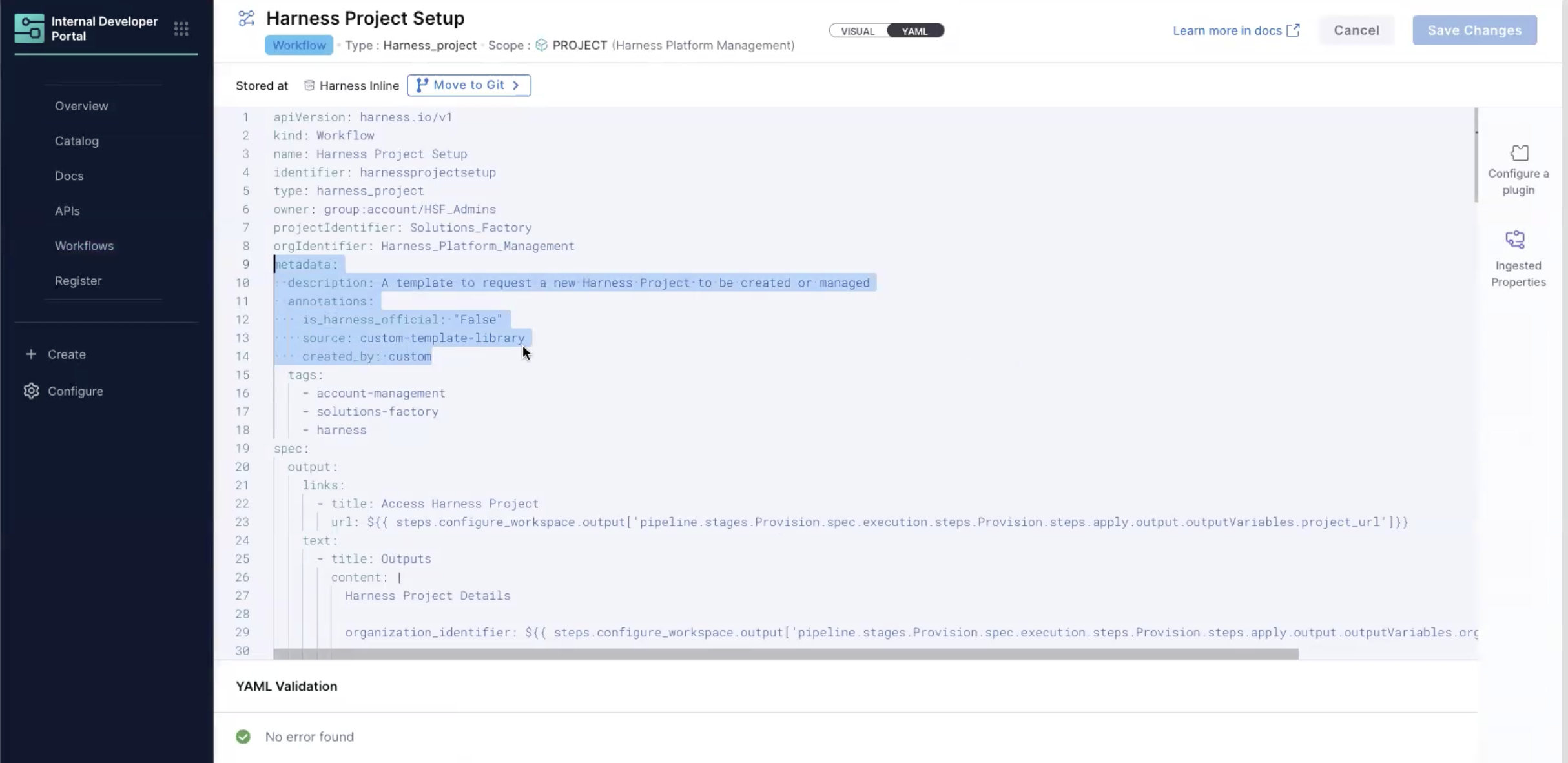 harness-projecttemplate - open the fileharness-project/.harness/catalog_template.yamlin VSCodenoteThere are account level variables that manage the configuration of the Custom Template Library Connector and Repositories. You can access these variables and adjust them by updating the variable in the Account Settings for the platform.