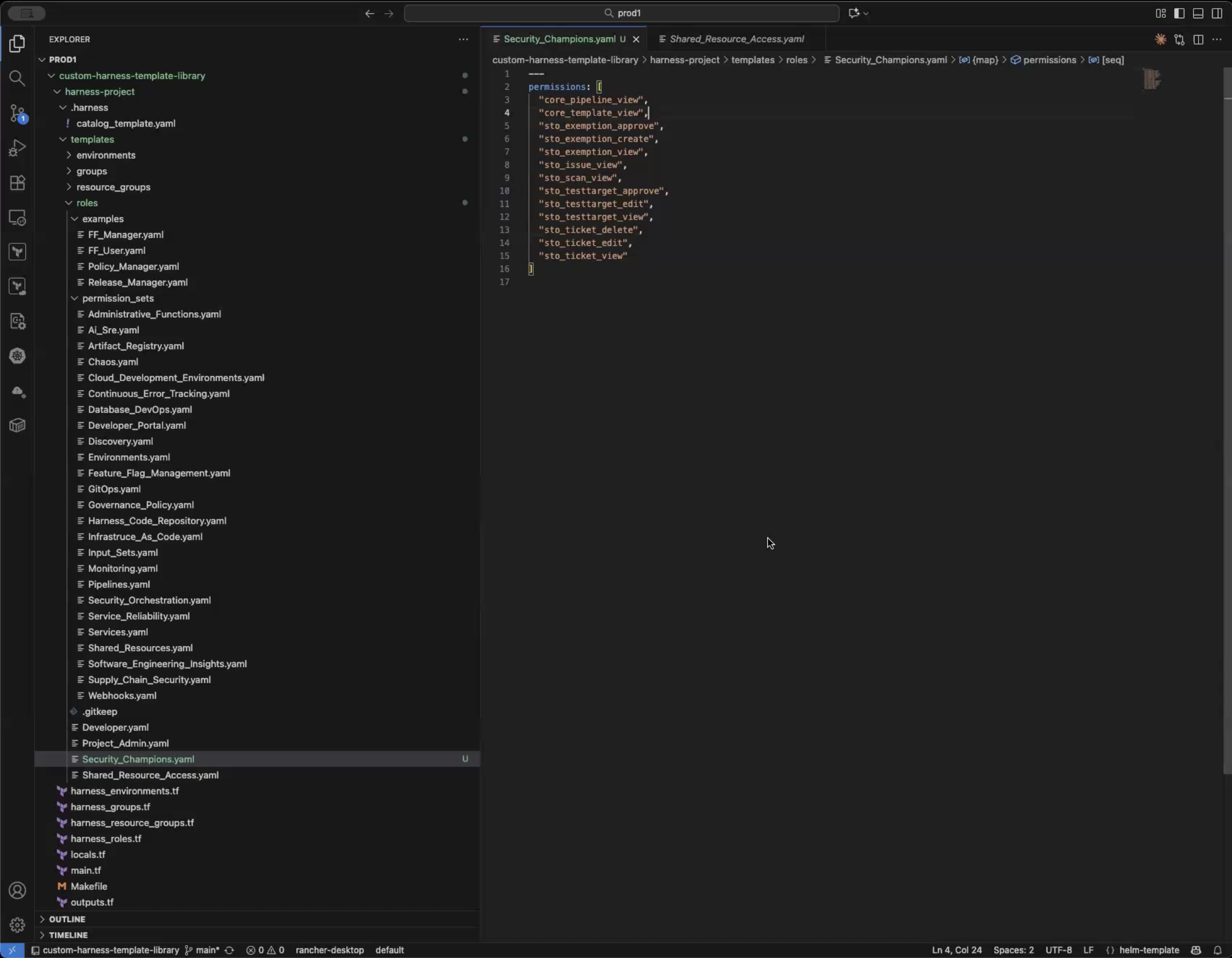 harness-project/templates/roles/Security_Champions.yaml - Sample permission sets are included under the