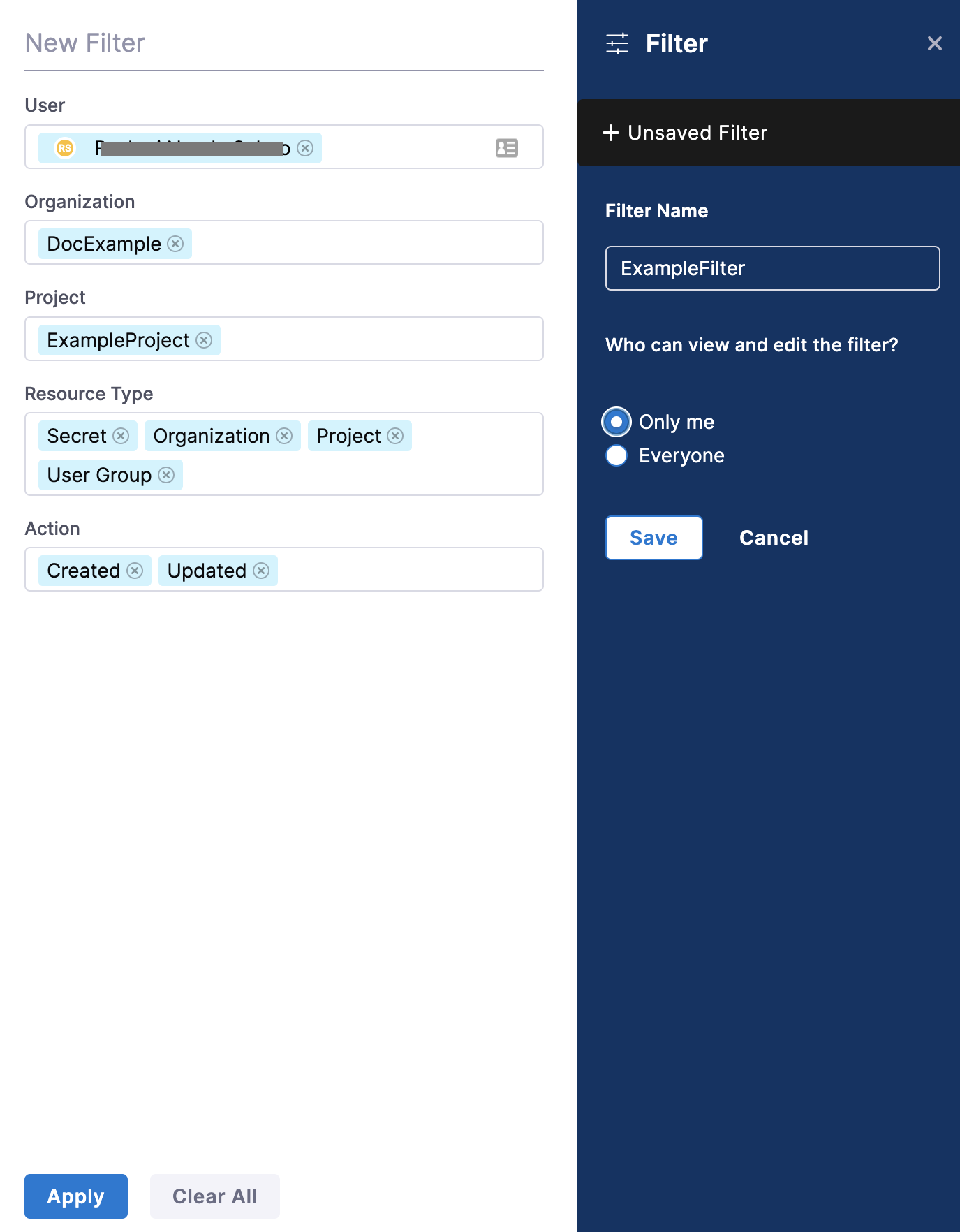 2. In the New Filter settings, select filters to refine audit events. Narrow the viewable events by adding filters and selecting: