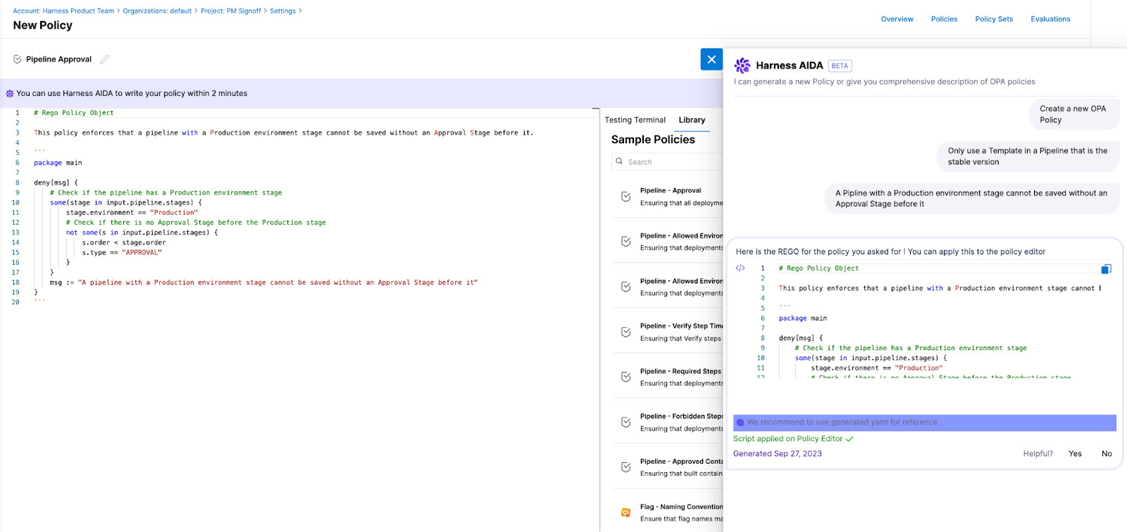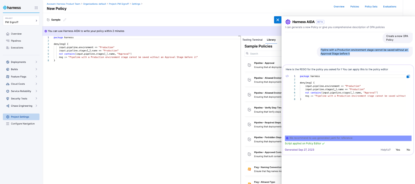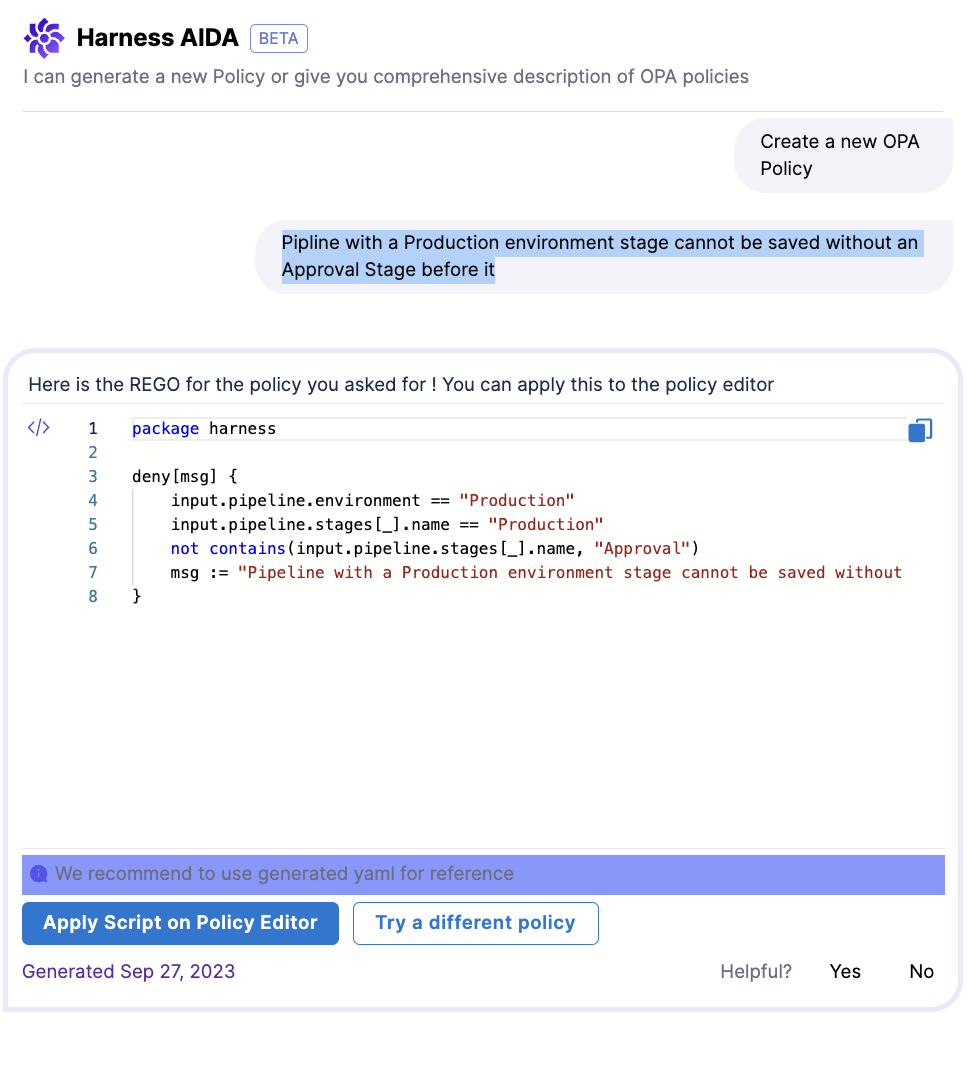 • Create OPA Policies: Harness AI helps you get started and write OPA Policies based on pipelines, connectors, and templates, and other Harness objects with no need to understand the nuances of REGO (Open Policy Agent language).