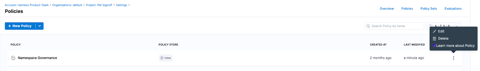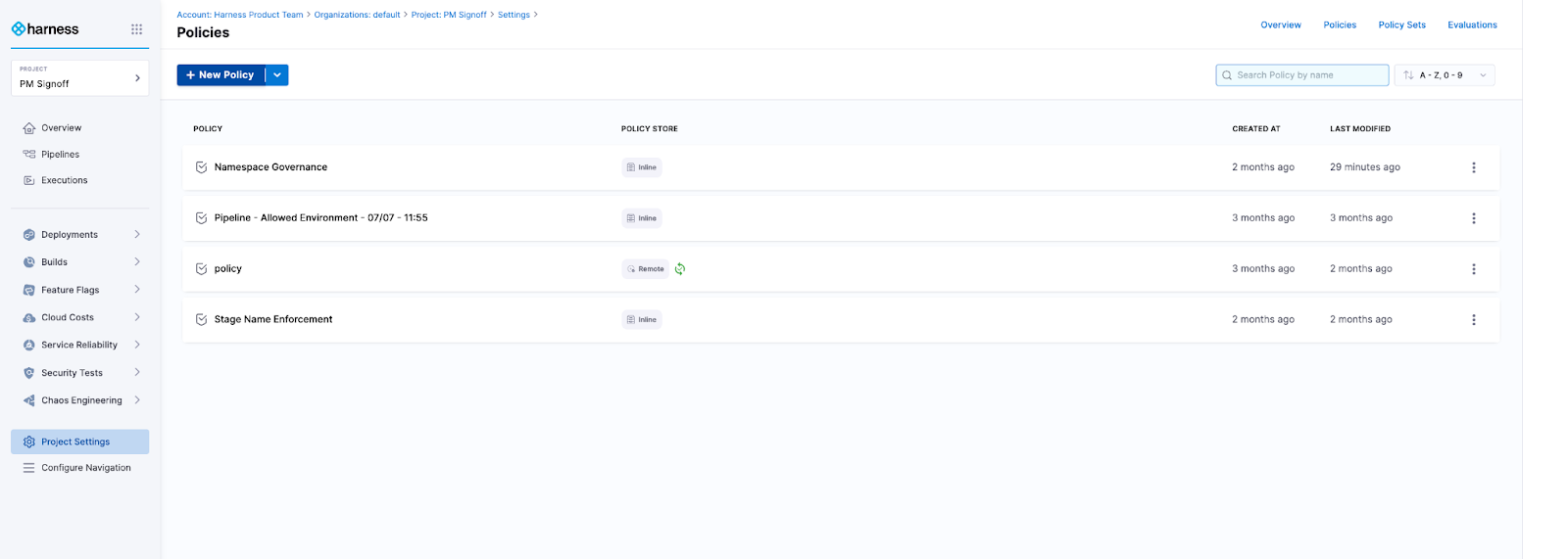 1. In the Harness application, go to Policies.