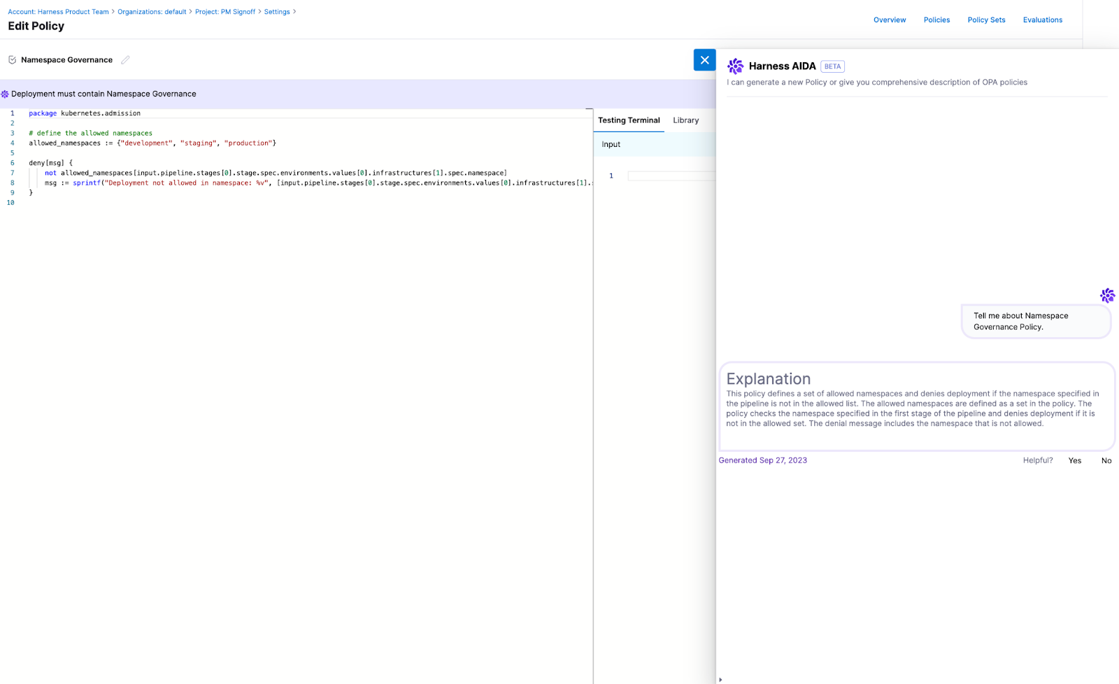 • Describe existing OPA Policies: Harness AI offers detailed descriptions of policies. This helps users understand what a policy does without having to fully understand REGO syntax and reading and tracing comments in the policy.