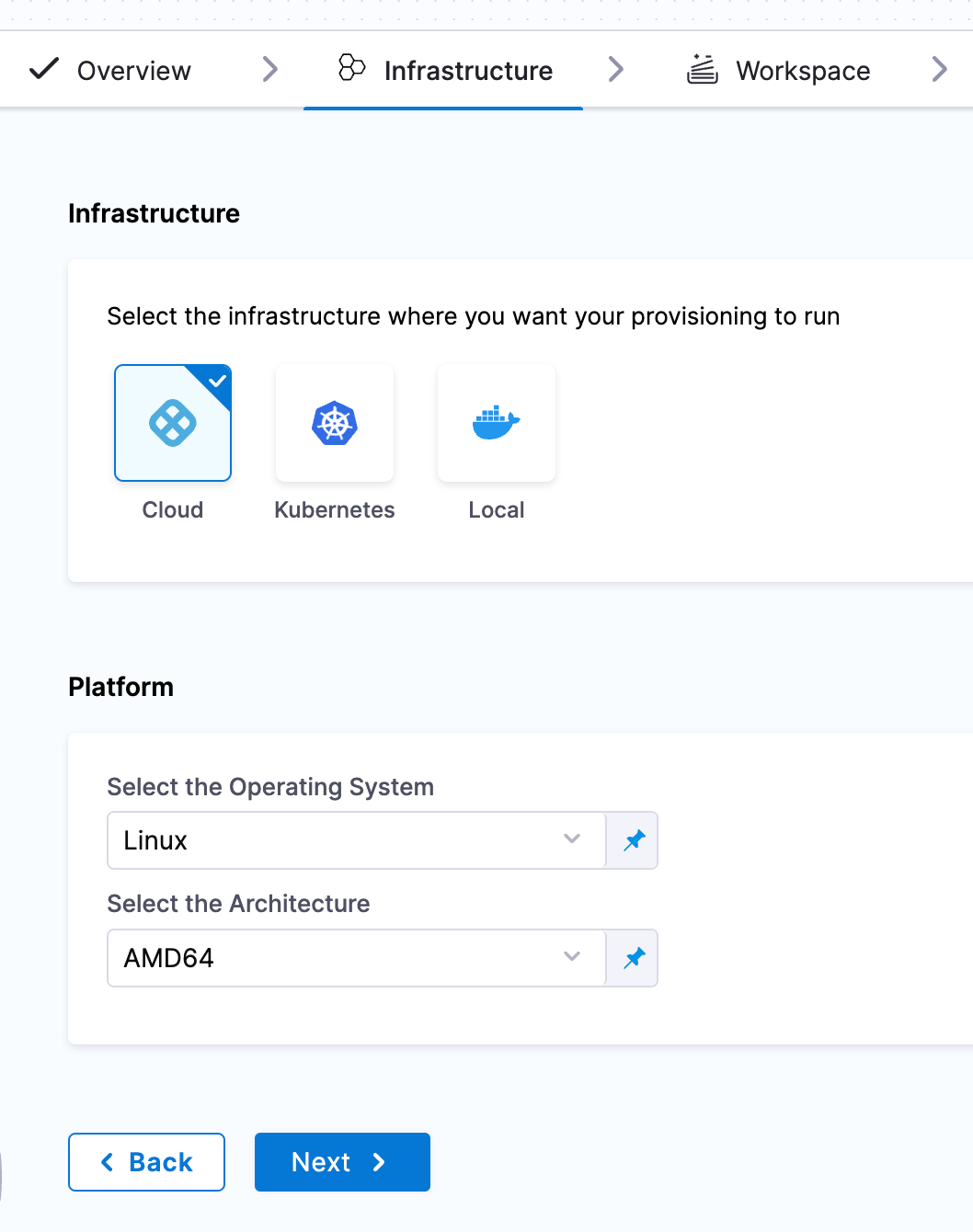 Now you can create a new IaCM pipeline, but when you get to the Infrastructure selection, select Kubernetes, find the connector we created, and select a namespace (that exists already) to run our pipelines in.