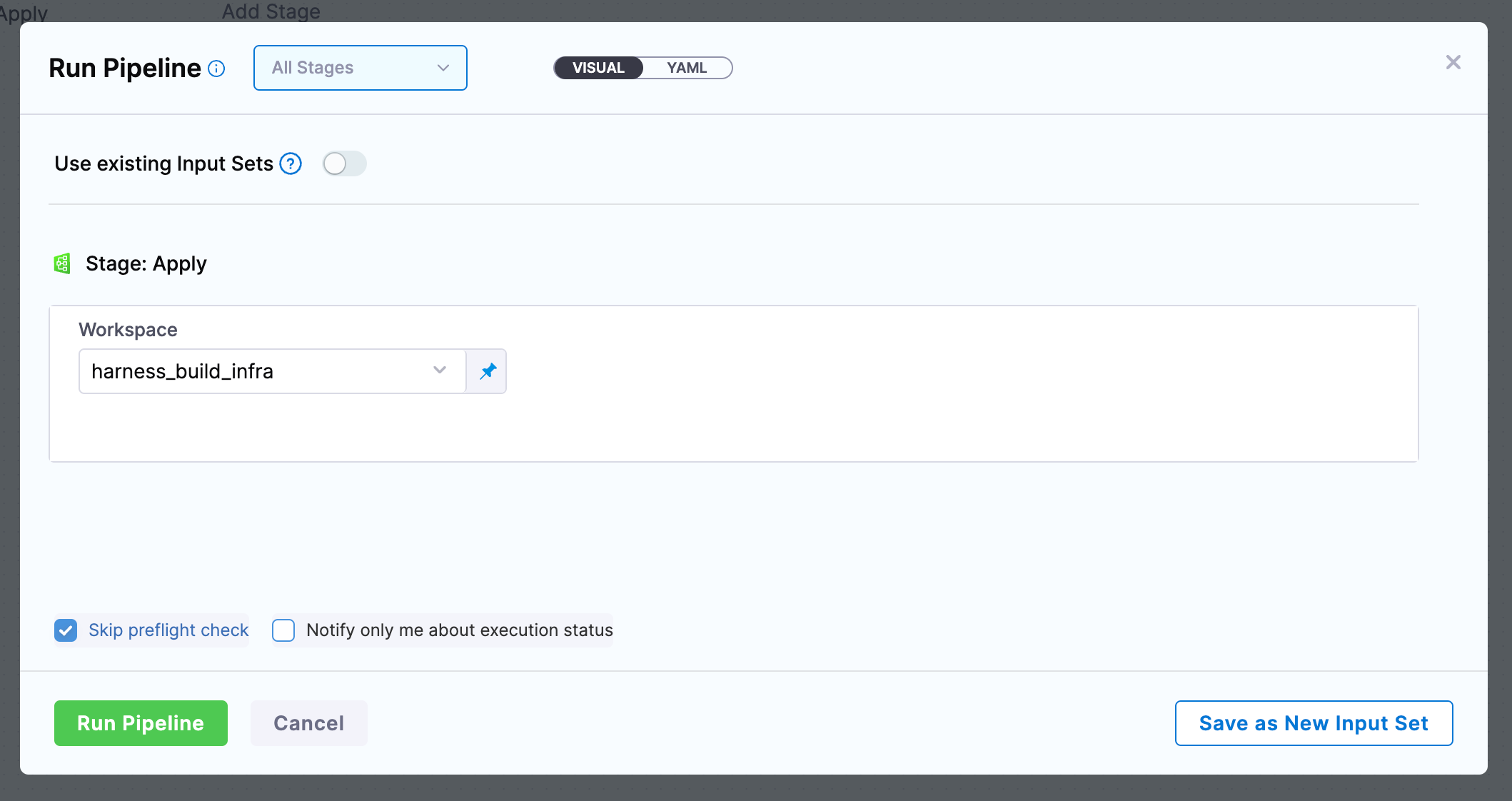 Set the workspace to Runtime Input, this will allow this pipeline to be used with other workspaces in the future.