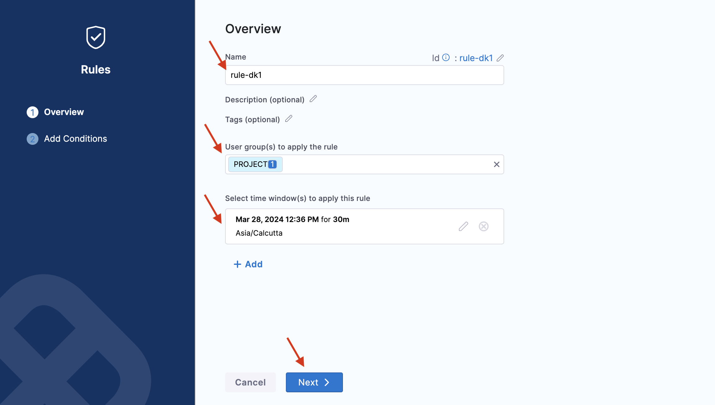 Specify parameters such as name, description (optional), tags (optional), user group to apply the rule (you can apply the rule to multiple user groups), and time window to apply the rule. You can apply multiple time windows to apply the rule. Click Next.