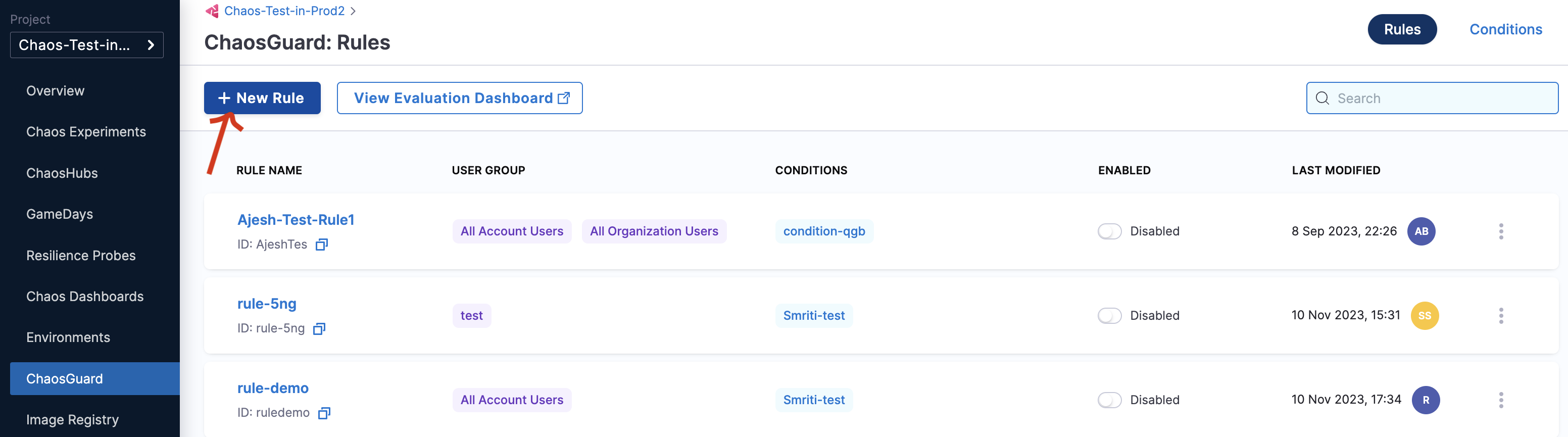 In the Chaos module, select ChaosGuard, and select Conditions. The Conditions page lists existing conditions (if any).