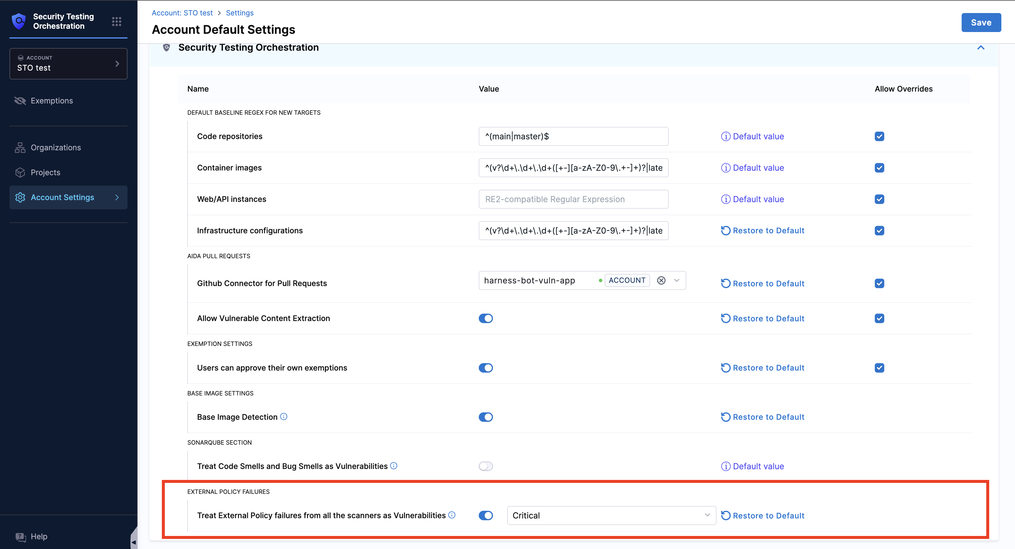 External policy failures are surfaced in Harness STO as a distinct Issue Type so that you can view External Policy Failures alongside other scan results.