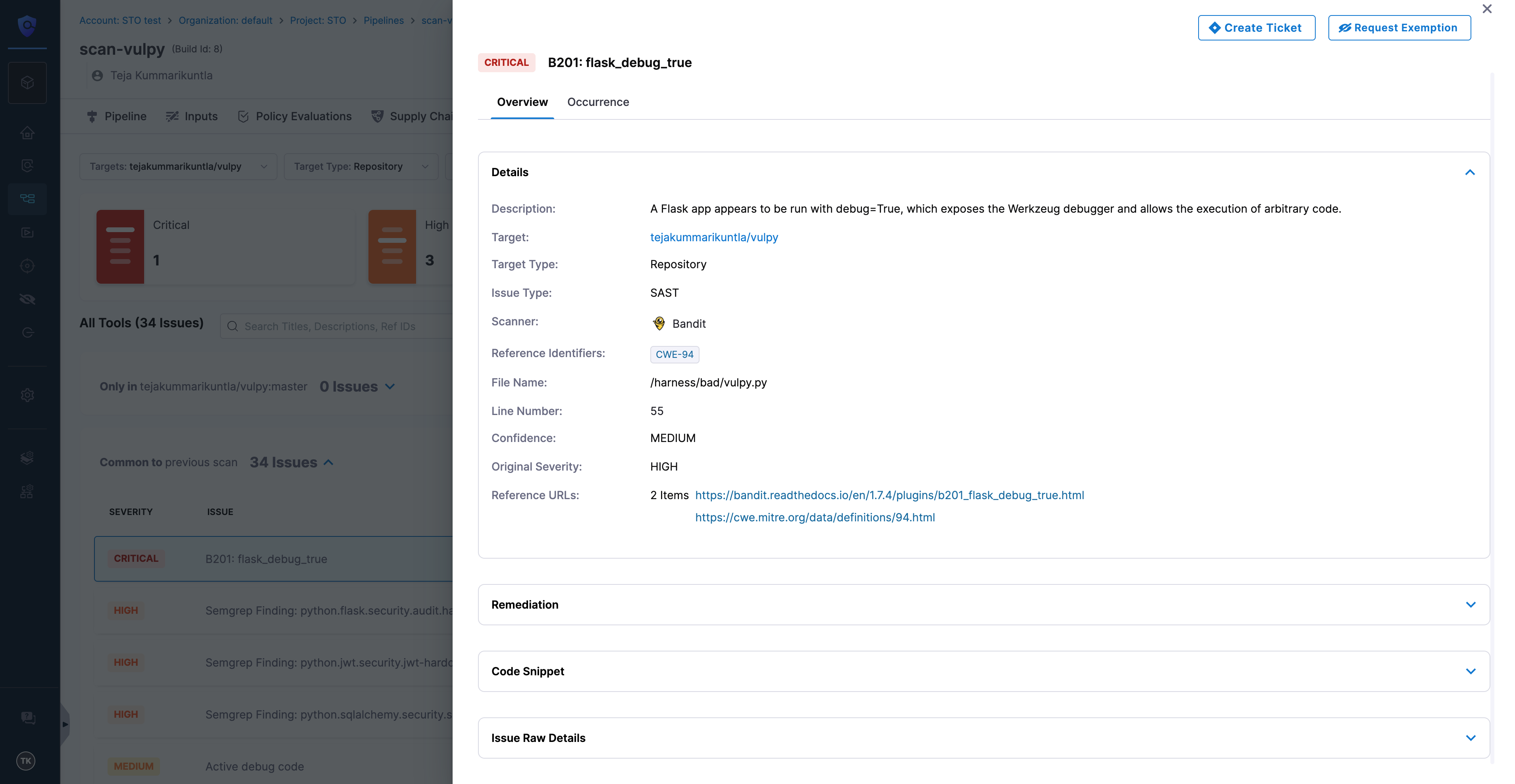 • Remediation: Remediation steps from Harness AI and Scanner. If scanning a repository, you can raise PRs or get code suggestions from Harness AI (see Fix security issues using Harness AI).
