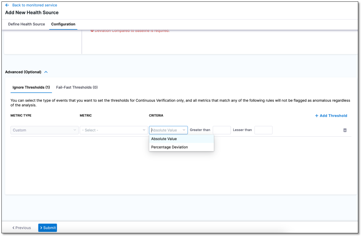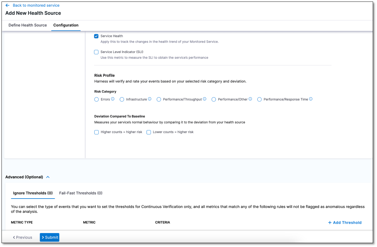 1. While setting up the threshold-compatible health source within a monitored service, navigate to the Advanced (Optional) section.