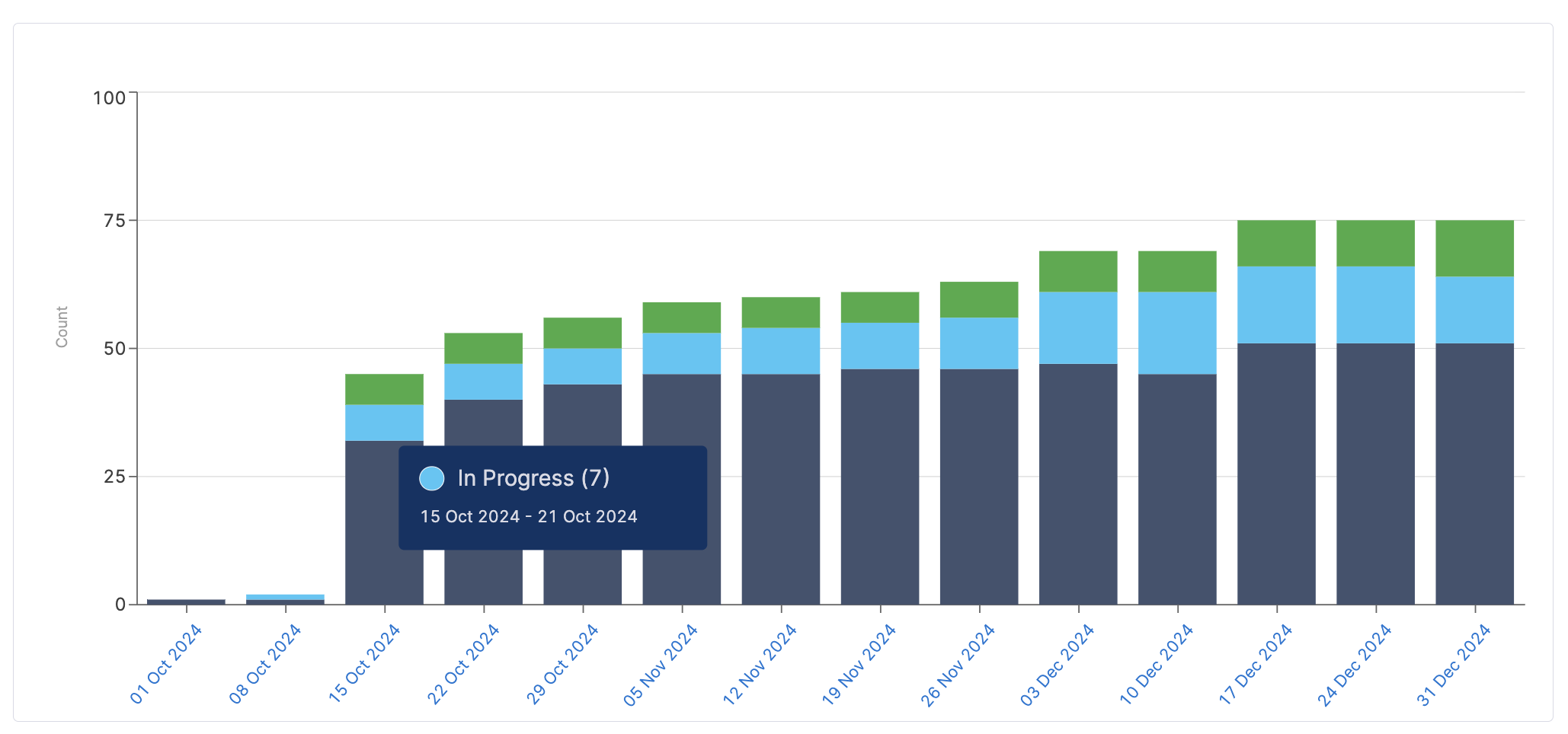 The bar chart view shows the weekly trend of epics across the selected duration, categorized as the status categories allowing teams to observe progress over time.
