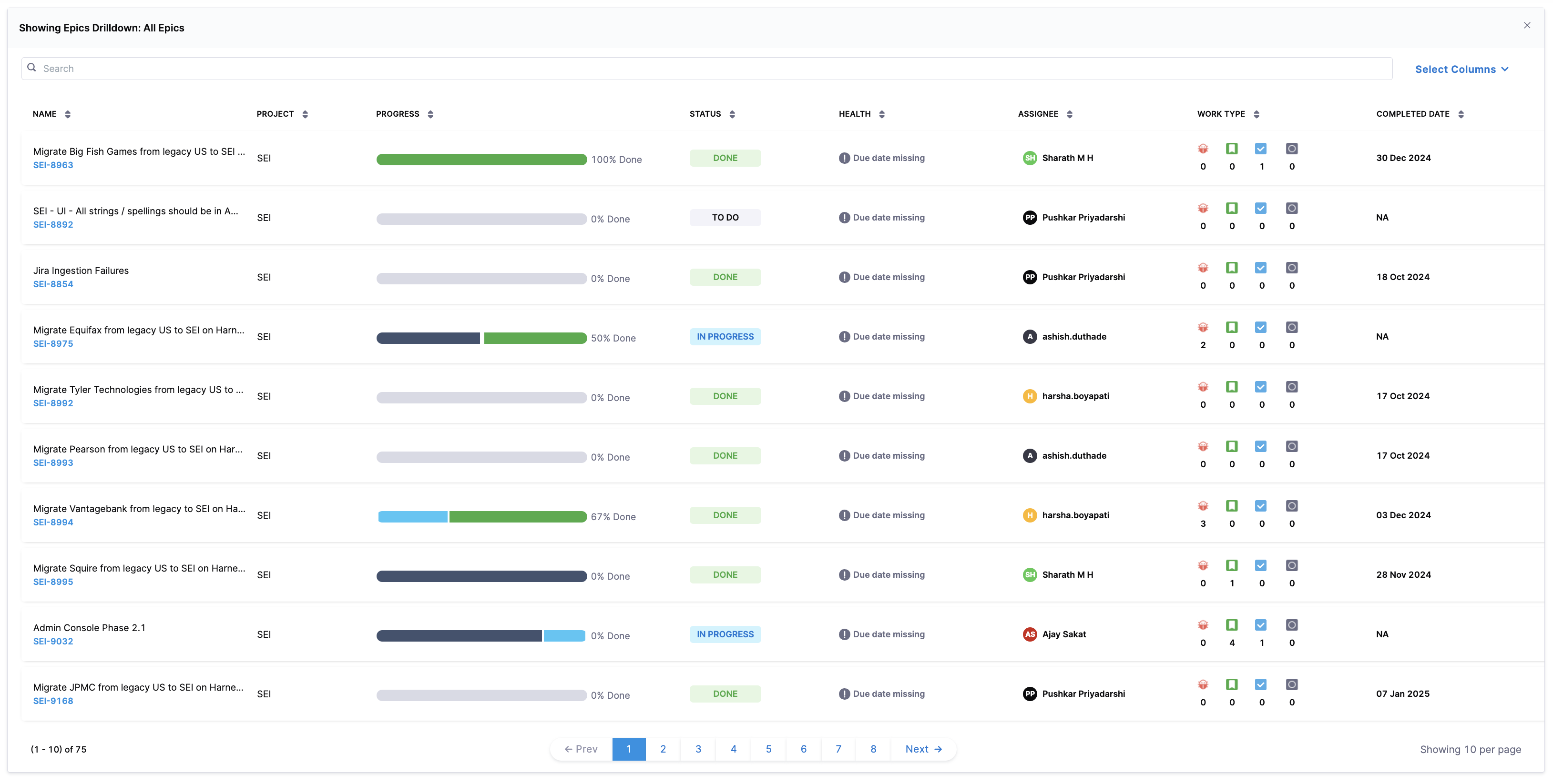 The following Epic tracking widgets in Harness SEI help monitor epic health and track key projects: